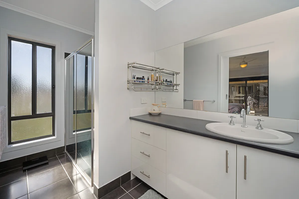 The master bedroom is generously sized, complete with a large walk-in robe and ensuite featuring a shower, vanity and enclosed toilet. A sliding glass door provides direct access to the rear outdoor entertaining area. The remaining two bedrooms are positioned nearby, both fitted with built-in robes.