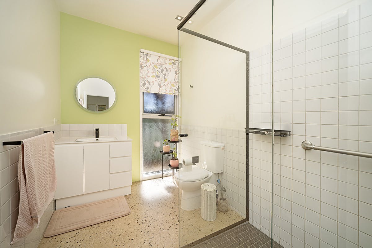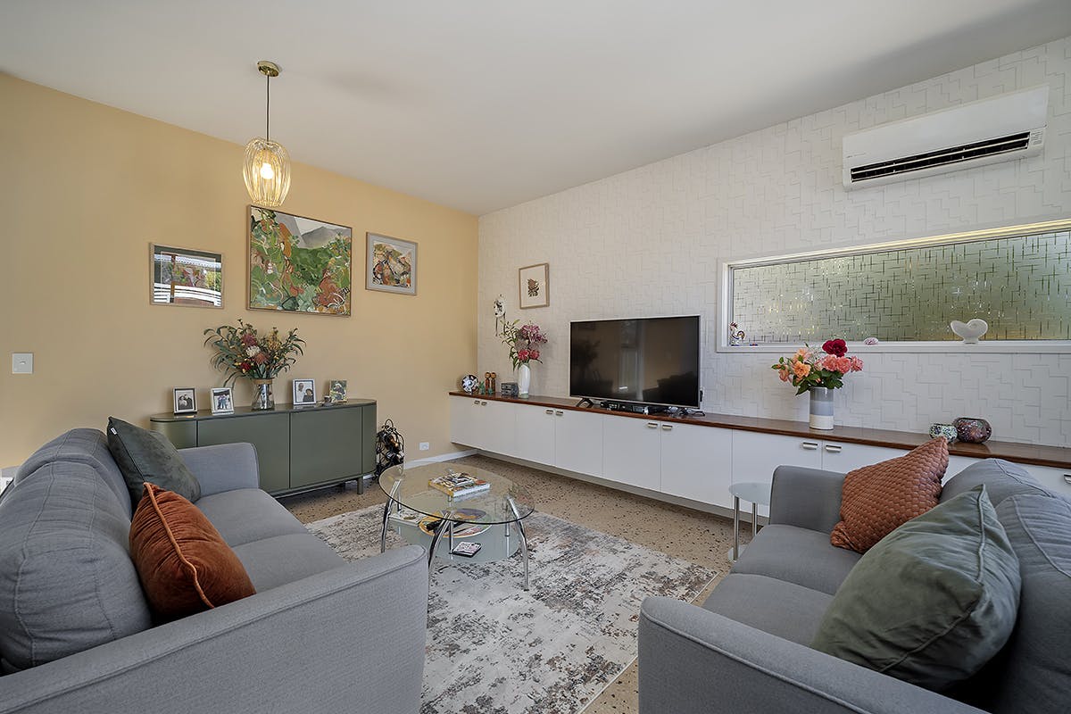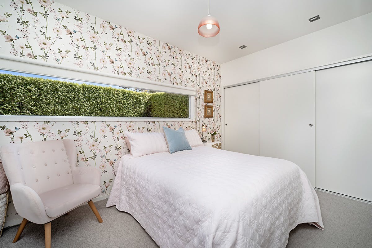 Accommodation comprises two well-proportioned bedrooms, both fitted with built-in robes, and serviced by a modern family bathroom. The bathroom includes a recently renewed shower and fittings, vanity, and toilet, while textural wallpaper throughout the home adds subtle character and depth to the interiors.