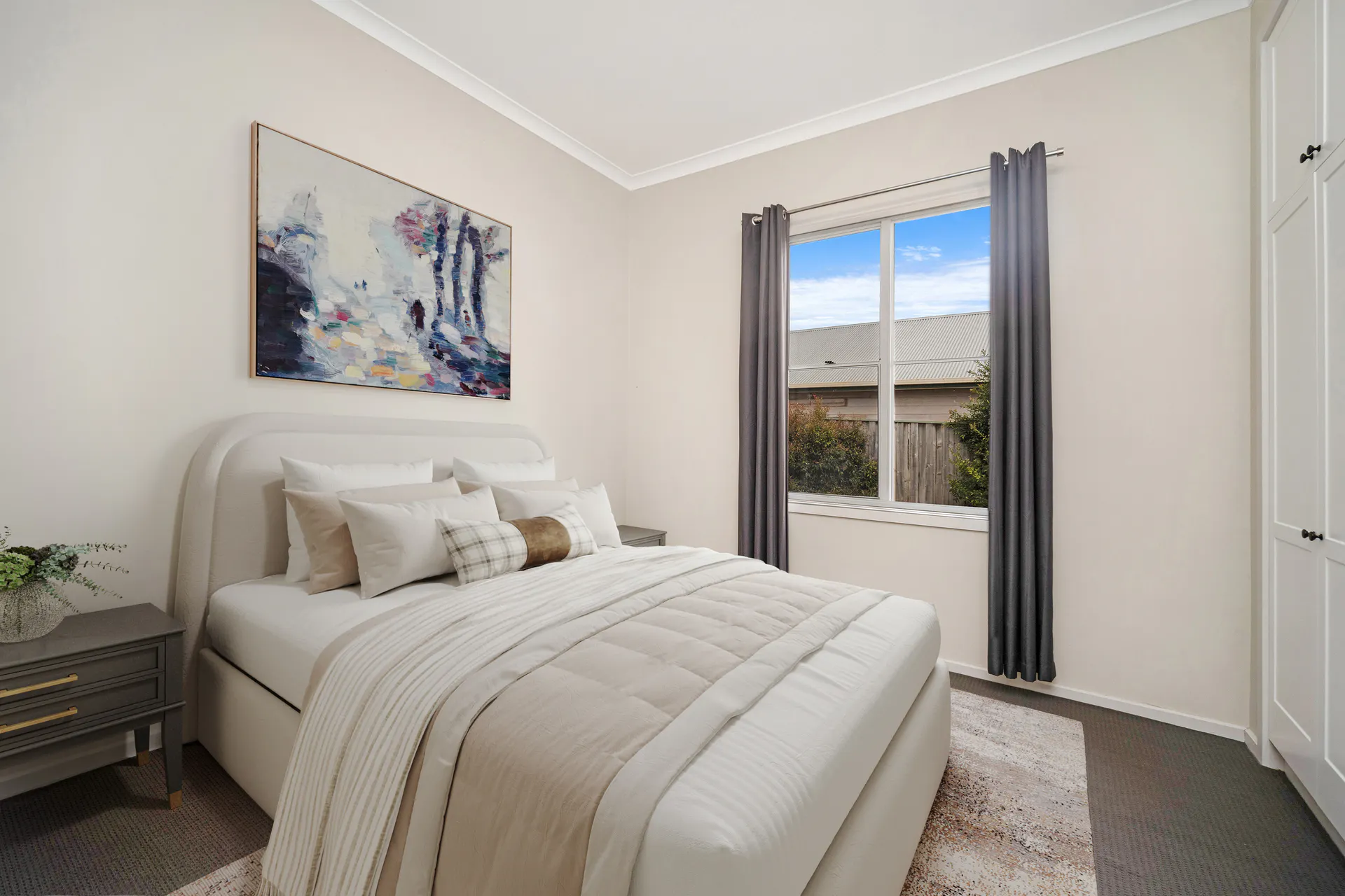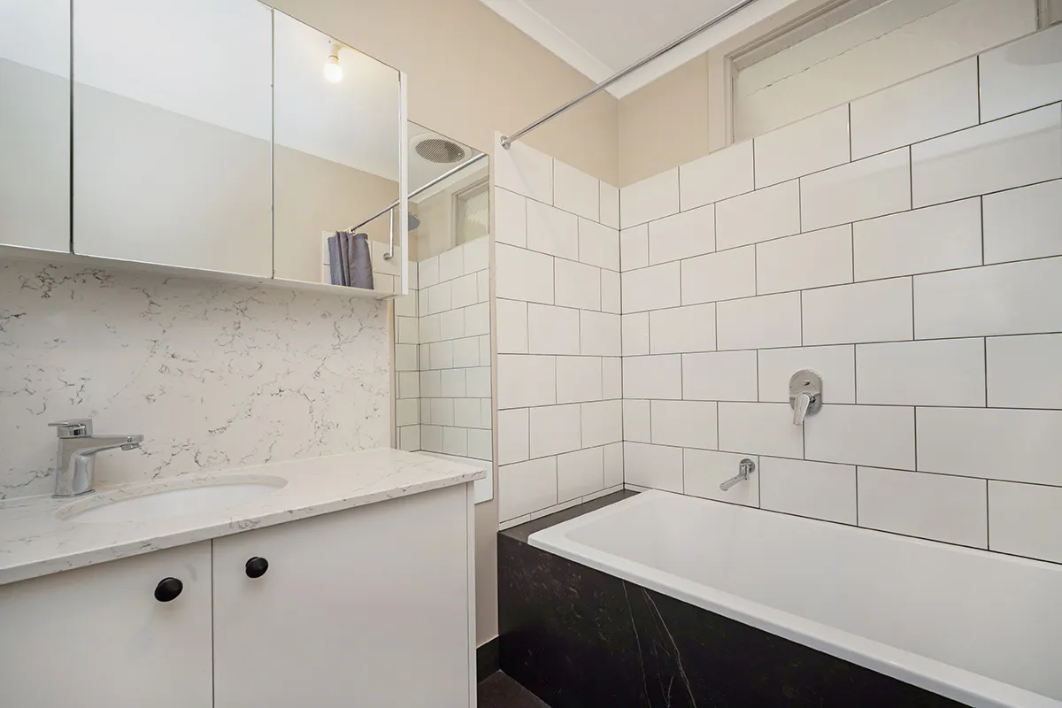 The home comprises three bedrooms, all replastered, with two featuring new built-in robes and the main complete with an overhead fan. The central bathroom has been tastefully refurbished in a timeless white and black palette, and includes a bath, vanity, toilet and practical storage options.