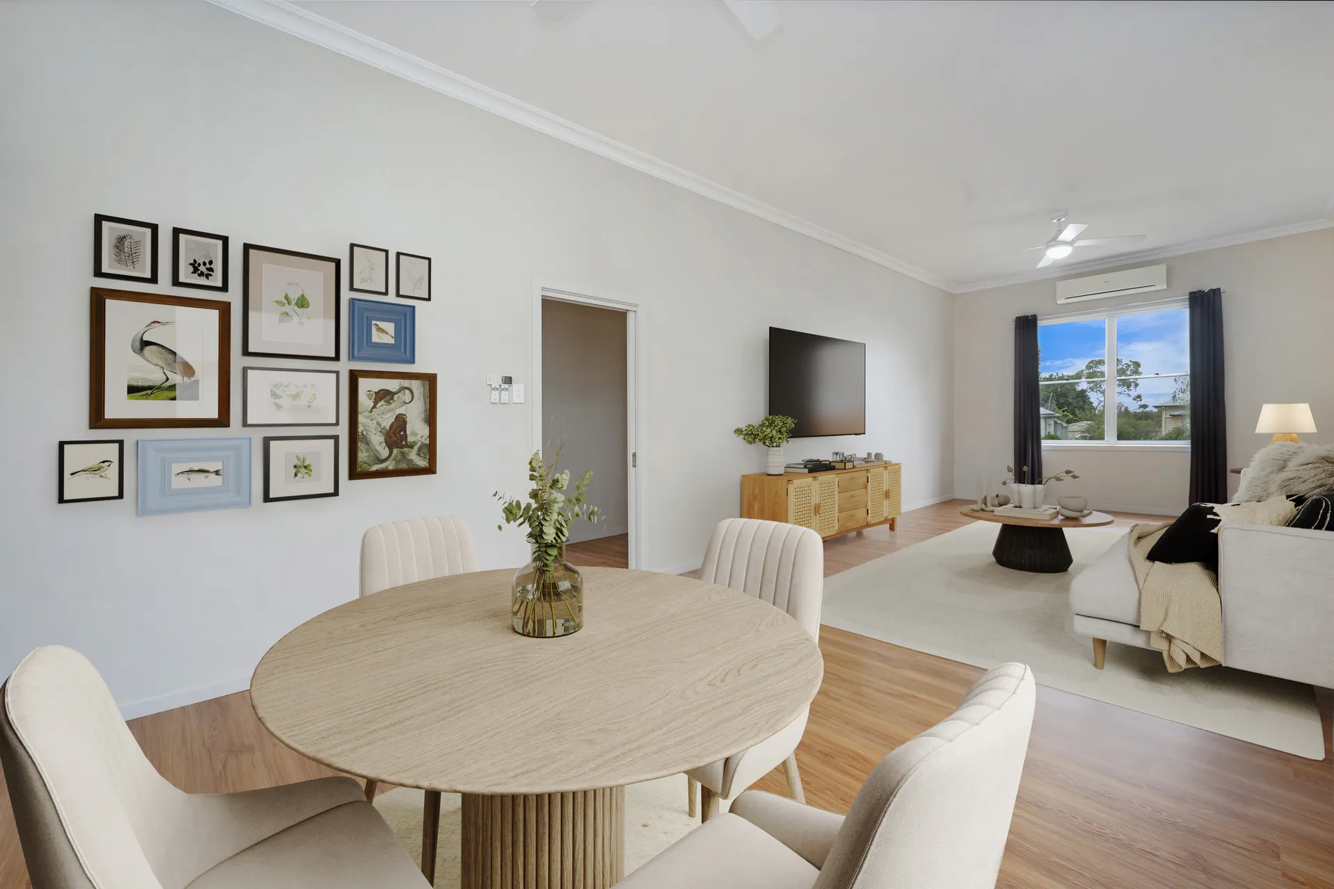 The central living room is well-appointed for year-round comfort with reverse cycle air conditioning and dual ceiling fans, while new flooring throughout and updated aluminium windows add to the home's modern appeal.